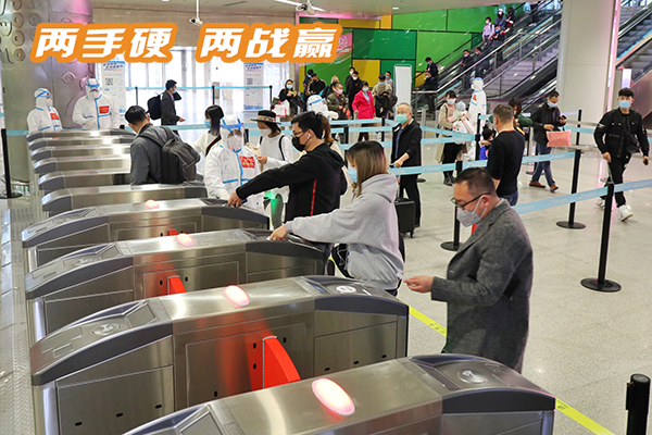 对此,信导部立即开始思考对策,计划对健康码识别设备进行再升级。实现自助查验的关键是健康码数据的来源。在与多方协调无果的情况下,技术人员提出将联通“健康ETC”设备嵌入闸机的方案。确定方案后,信导部克服了数据互通、设备选型采购、现场安装工人紧缺等多重困难,争分夺秒,从接到任务到完成安装用时不到一周,化不可能为可能,最终成功实现了15条健康码自助查验通道的投用。投运首日截至下午3点,已累计有效查验旅客7000余人。