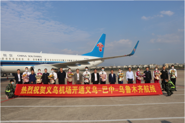 11月1日下午,由南方航空公司执飞的义乌-巴中-乌鲁木齐航线首航,义乌机场举行了简短的首航仪式。义乌市委常委、常务副市长喻新贵;义乌市委常委,四川省巴中市政府副秘书长、巴州区委常委、副区长谢国才;汕头航空公司党委书记、副总经理崔华杰出席。