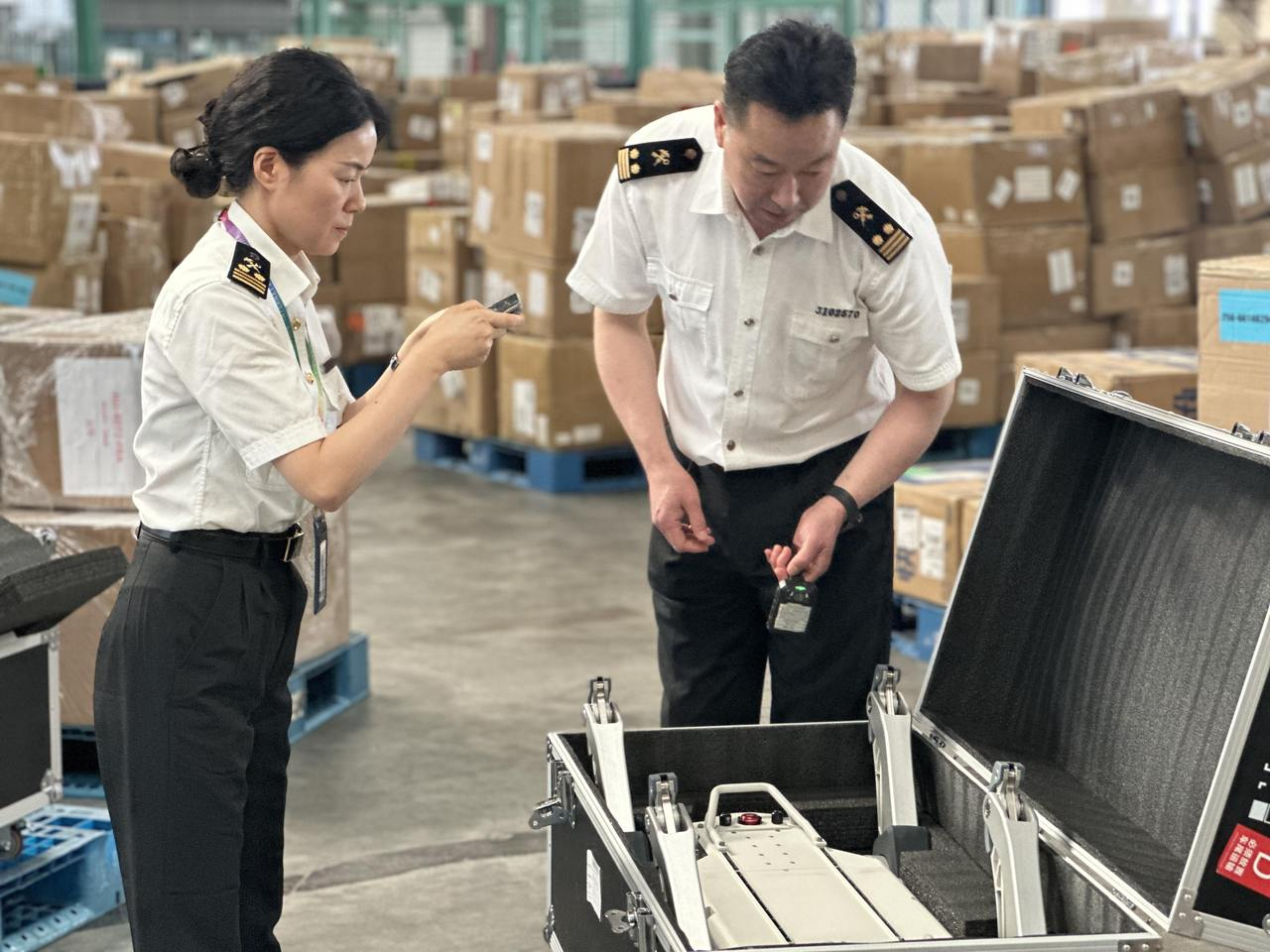 宁波机场海关关员对出口四足机器人进行查验。吴若竹摄
