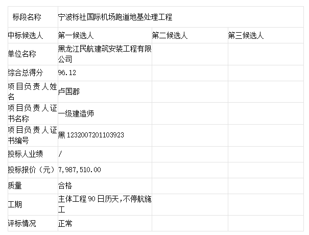 项目名称:宁波栎社国际机场跑道地基处理工程备案记录编号:民航华东招标备字〔2025〕18号项目的招标评标工作已经结束,经专家评审,评标委员会推荐了本项目中标候选人,公示期2025-03-14 11:00:00至2025-03-21 23:59:59。
